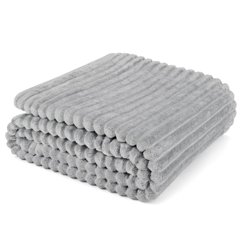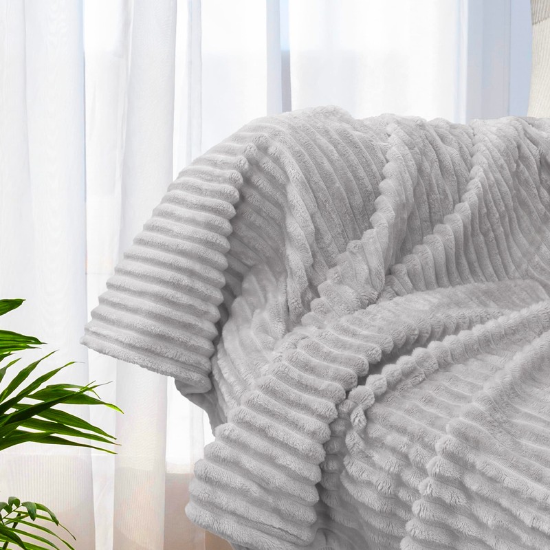 - DECORATIVE THROW BLANKET: This Light Grey blanket throw effortlessly complements and accents your bed, sofa, couch, chair, and your living room, dorm, office decor. Enhance the ambiance of any room with our decorative cute microplush blanket. Its ribbed design and classic stripe textured pattern is visually appealing, adding sophistication to mix and match your home and bedroom decor. The throw blankets light weight fluffy feel makes it a versatile choice for every season.