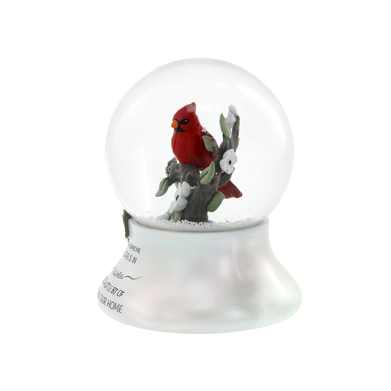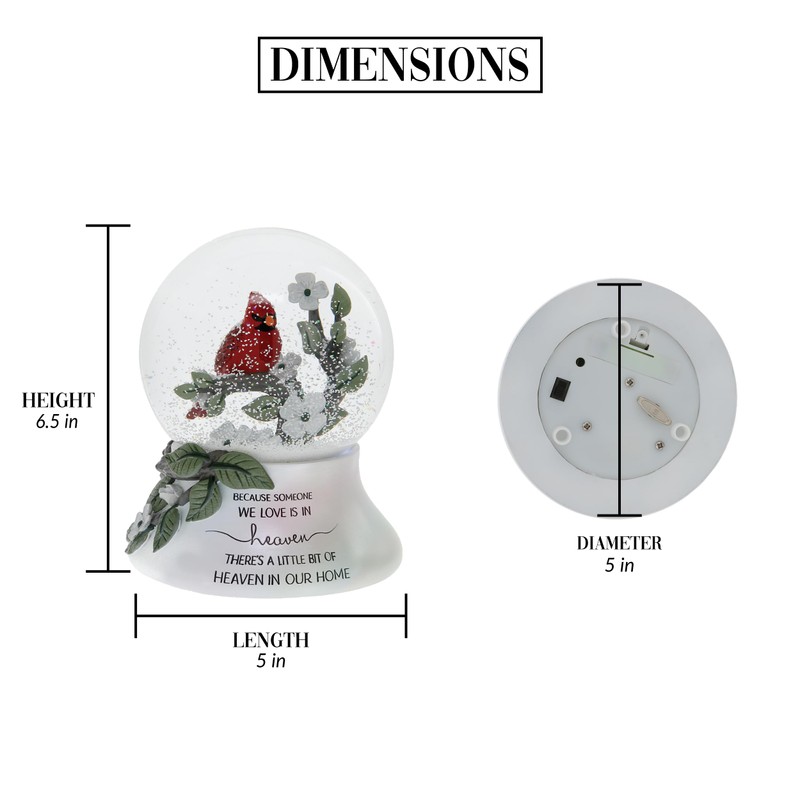 - IN-HOUSE DESIGN: The red cardinal sits on a cherry blossom branch inside the globe. The bottom front section has a "Because Someone We Love Is In Heaven, There's A Little Bit Of Heaven In Our Home" sentiment. When twisted, the piece pipes "Wind Beneath My Wings."
