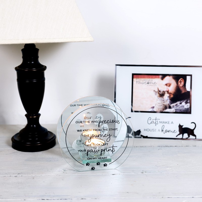 - HOUSE DESIGN: "Our Time Was Precious We Knew From The Start, The Journey We Took Left Your Paw Prints On My Heart" is printed in dark gray and accompanied by a round line and paw print design on the front glass piece.