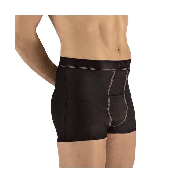 Pavis Medically Approved Hernia Boxer Shorts - INCLUDES x 2 HERNIA PADS - Designed to contain, support & reduce inguinal, lower abdominal & scrotal hernias (S) Waist 28" Black