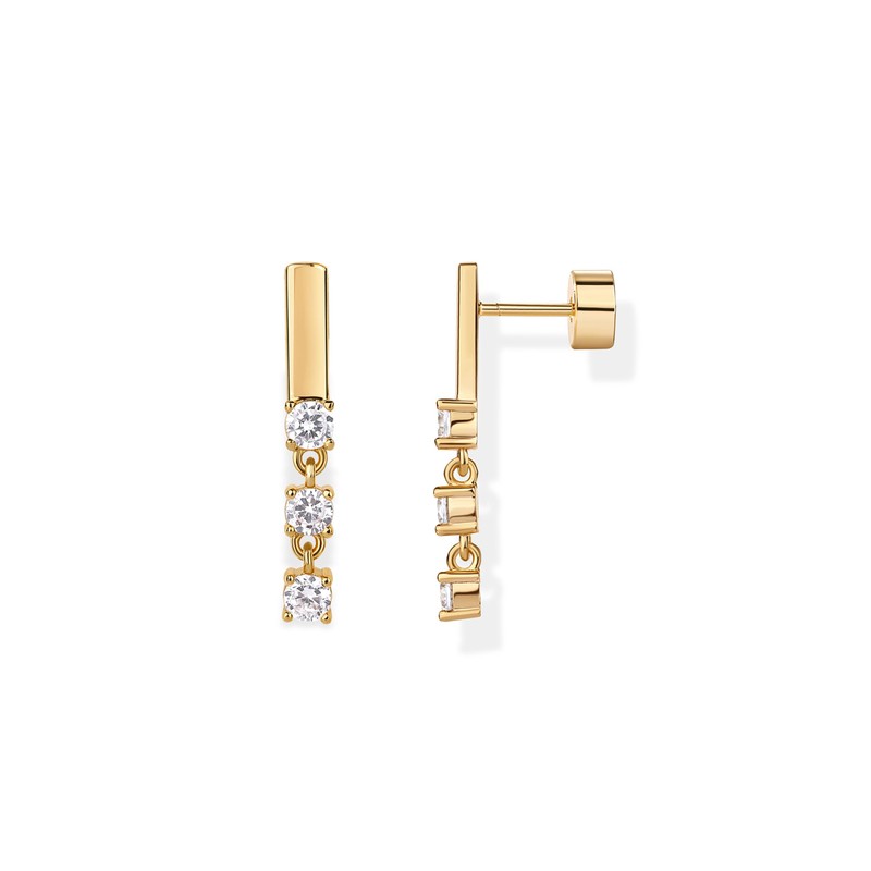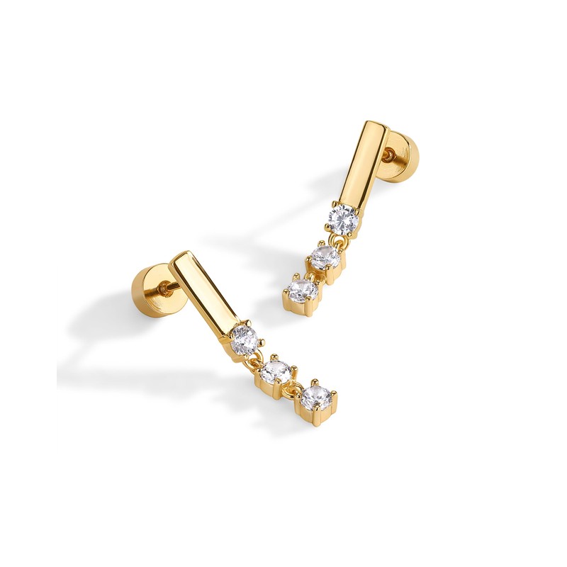 - Three is better than one with these 14K yellow gold-plated mini drop flat back studs. Each stud measures 23mm long and features 3mm dangling cubic zirconia stones, along with 925 sterling silver posts secured with screw back closures.