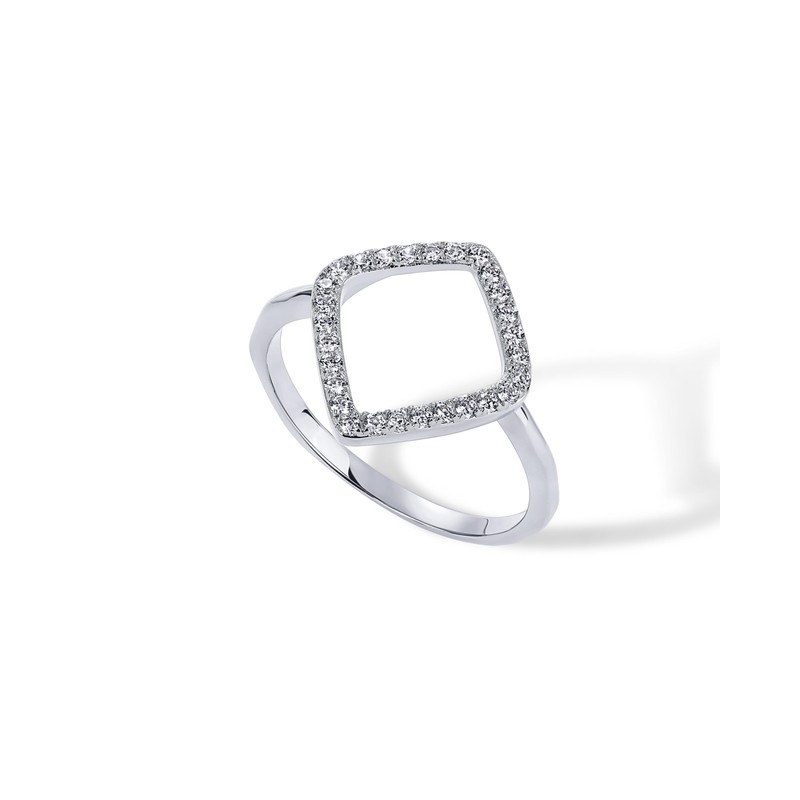 - This rhodium plated kite-shaped ring has a 1.6mm wide band and features a 15mm x 13mm diamond-shaped design with 1.2mm premium cubic zirconia stones.
