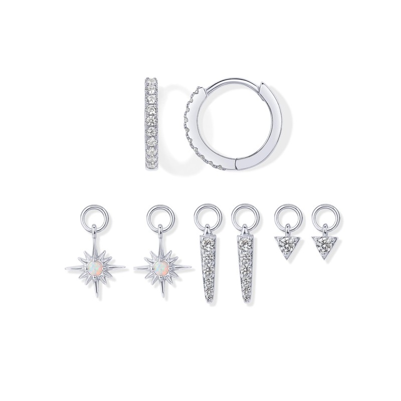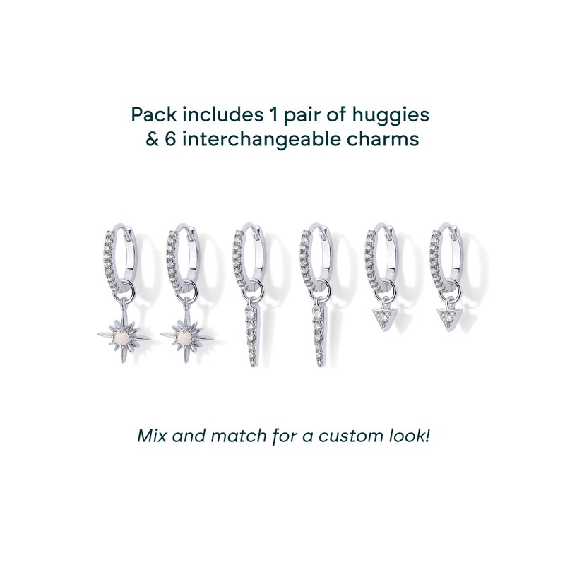 - Switch up your look daily with a mix-and-match pack featuring one pair of huggies with a 13mm outer diameter and three pairs of interchangeable charms. Create the perfect custom look with charms that easily slide on and off. This set is designed to be styled your way, with interchangeable charms featuring opal and premium cubic zirconia stones.