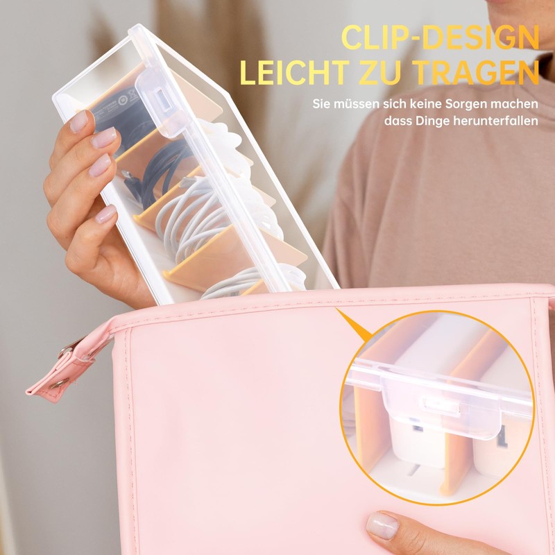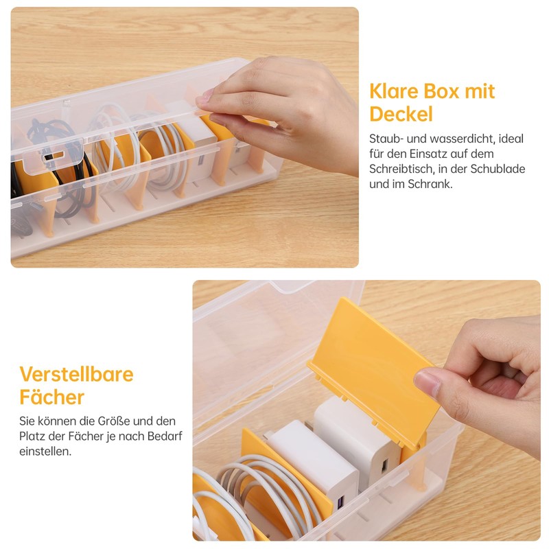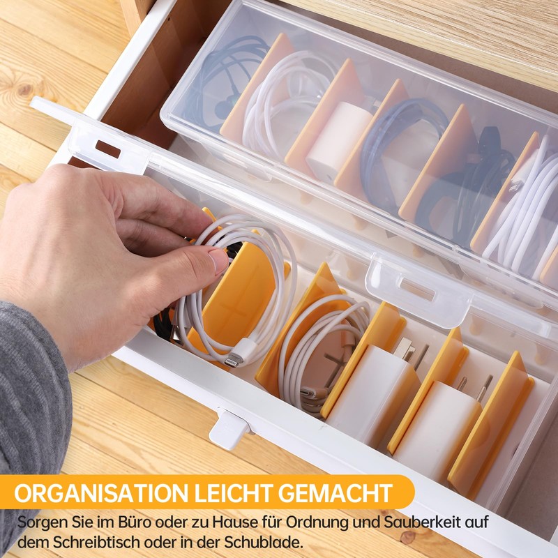 - Numerous advantages: the cable organiser is more than just an ordinary container, it is a well thought-out accessory with numerous advantages. Its main purpose is to provide a special place for storing various chargers so that they do not get tangled or lost between other items.