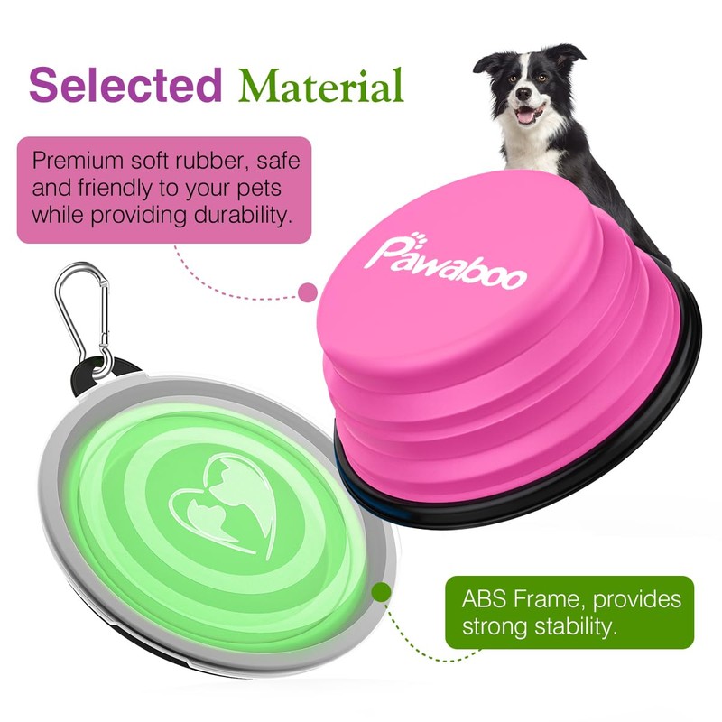Pawaboo Collapsible Dog Bowls 2 Pack, Silicone Feeding Watering Bowls with Lids & Carabiners for Dogs Cats, Portable Water Feeder Food Bowl for Walking Traveling Home Use, Pink + Green