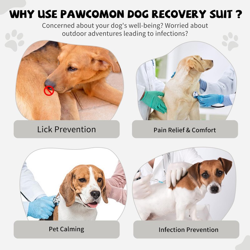 - 【Recovery Suit Size】Pawcomon dog surgery suit is available in 6 sizes (XS-XL), The dog onesie suitable for most small, medium and large dogs, such as: Bulldog, Rottweiler, Poodle, Beagle, French Bulldog, Golden retriever, Labrador, etc. Please note that proper healing of dog wounds after surgery requires a snug-fitting recovery suit.