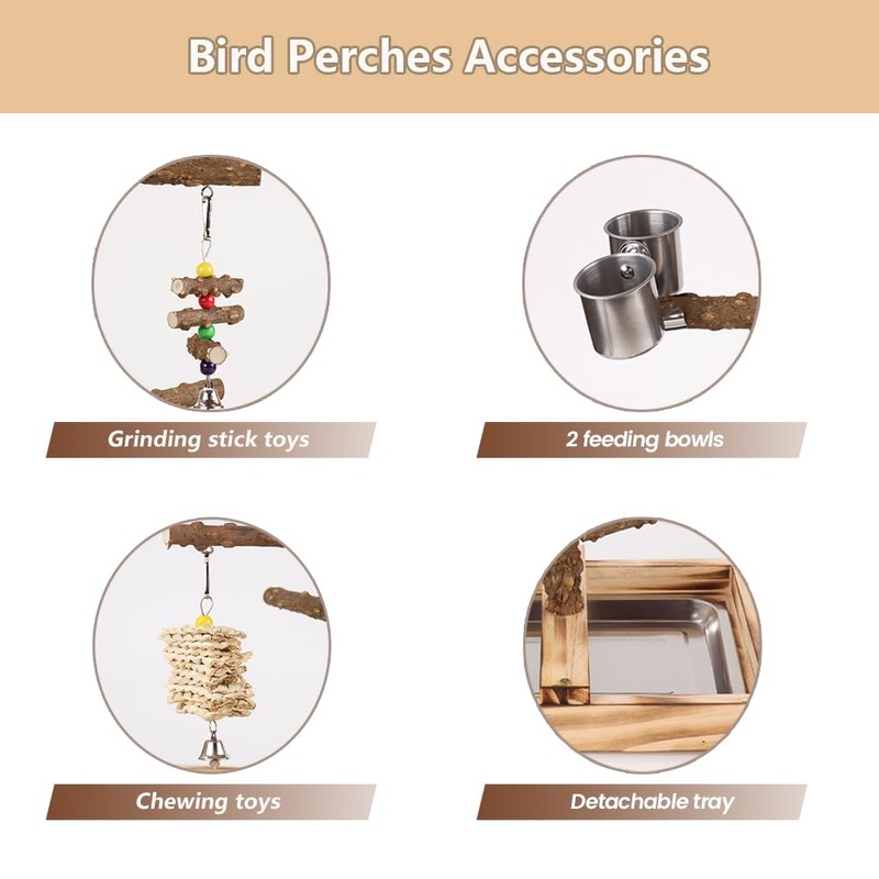 The bird perch stand doubles as an interactive playground for your avian friend, featuring bottom is equipped with a stainless steel detachable tray, which is easy to operate and can carry your bird friends' household waste. It is also easy to disassemble and clean, and there are 2 feeding bowls and bird biting toys to meet the living and playing needs of bird friends.