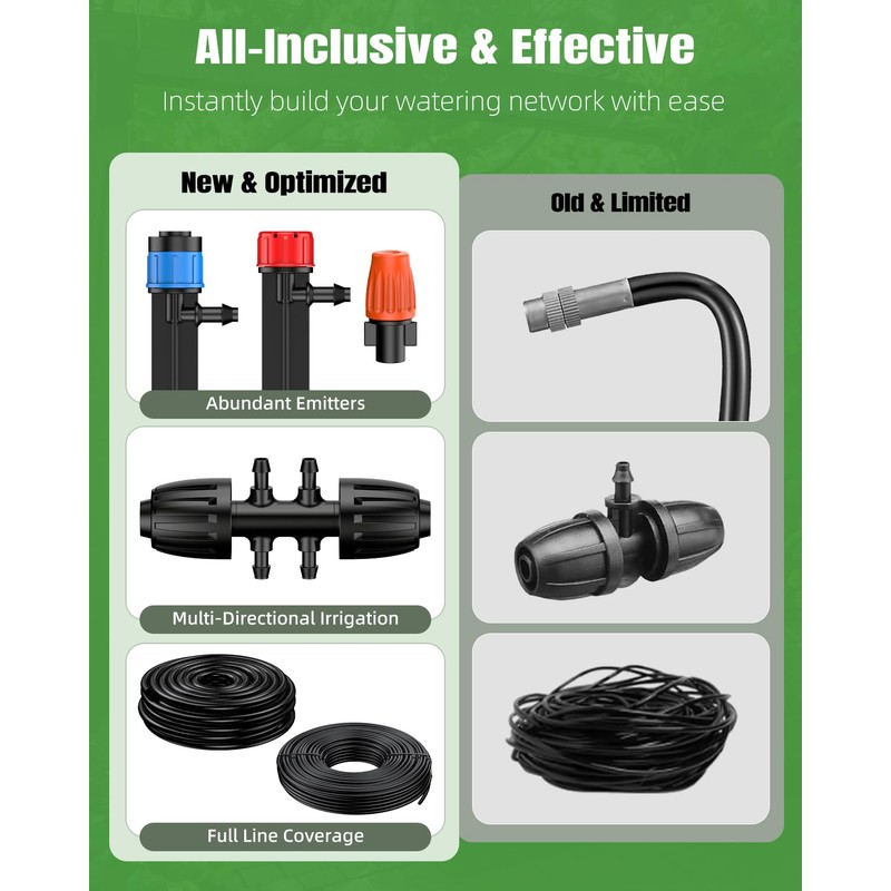 - Versatile Watering Options: Large-scale irrigation made simple! Totally 3 types of adjustable emitters for your choice – sprinklers, sprayers, and misting nozzles. Easily customize water flow for every plant, from delicate seedlings to mature crops
