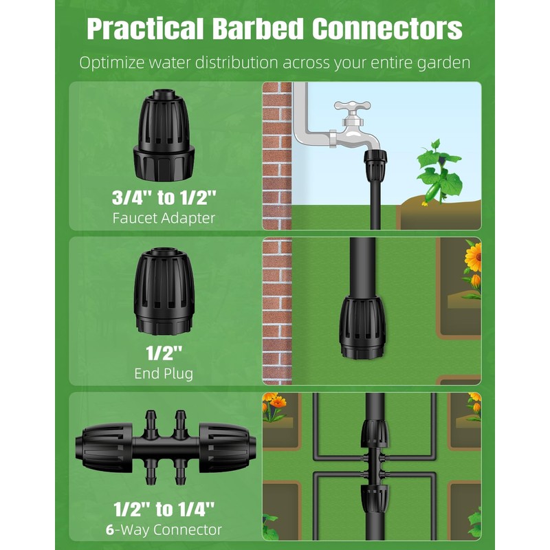 - Multi-Way Barbed Connectors: Optimize water distribution across your entire garden! The barbed fittings create watertight seals throughout the drip irrigation system. (NOTE: For a quicker fit, briefly soften the tubing in hot water before connecting.)