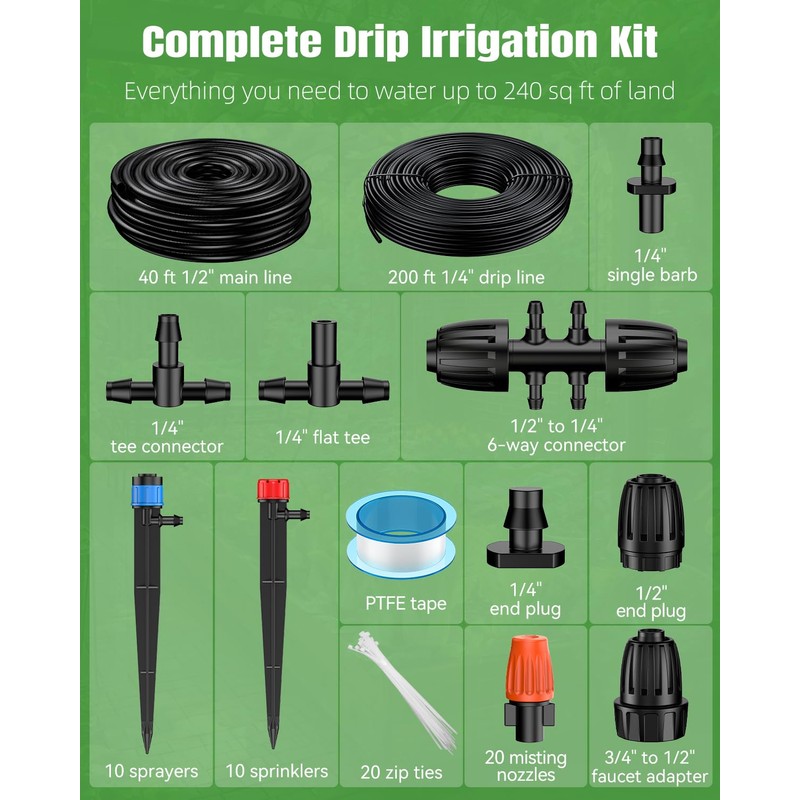 - Complete Drip Irrigation Kit: Everything you need to water up to 240 sq ft of planting space! Include 40 feet of 1/2" main tubing, 200 feet of 1/4" distribution tubing, and over 100 essential accessories. Perfect for a large garden or two 120-foot areas