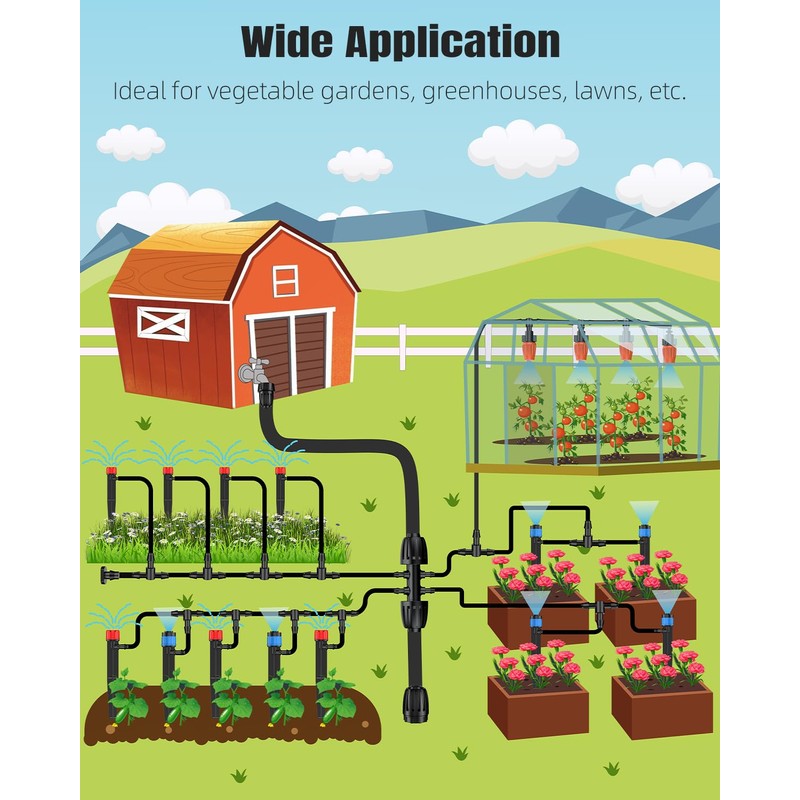 - Wide Application: Cut irrigation water usage by up to 80% with this efficient garden watering system. Ideal for vegetable gardens, greenhouses, patios, lawns, yards, raised beds, etc. Effortlessly transform any growing zone into a thriving garden oasis