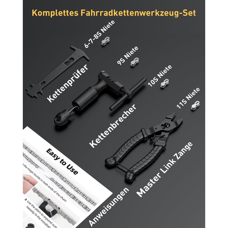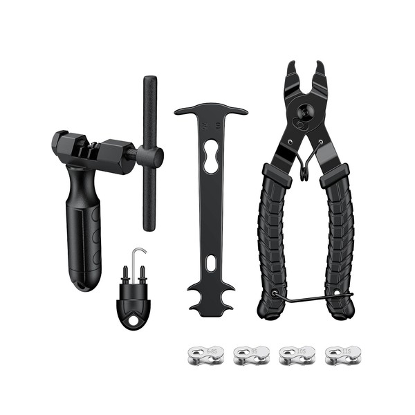 - Bike Chain Tool Kit: Complete bicycle chain repair tool kit - chain breaker, master link pliers, chain tester, 4 pairs spare chain rivets (6-7-8, 9, 10, 11 speed) and instruction manual. A must have for serious cyclists and weekend getaways