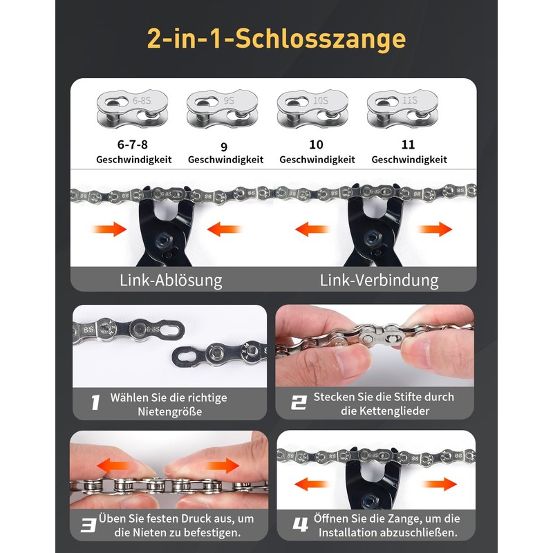 - 2 in 1 Main Link Pliers: Dual action pliers allow you to effortlessly mount and remove main links on 7-12 speed chains. The textured plastic handles ensure a firm grip at all times, while the locking ring keeps the pliers securely closed for neat storage