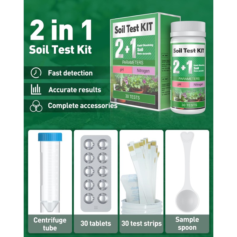 • Easy to Use: Dissolve a tablet in 25ml of pure water in the tube. Then add 2 spoons of soil, cap it, shake for 60s, and stand it for 10-15 min. Last, dip a test strip into water for 10s, and match it to color chart for pH. Check the nitrogen result at 60s