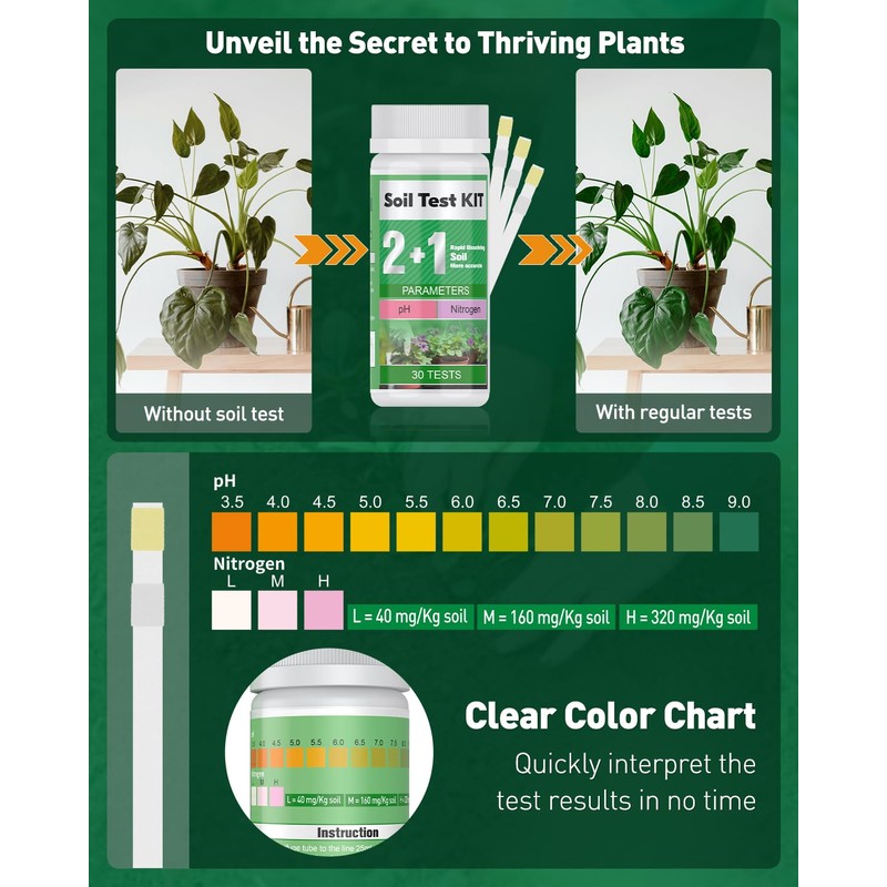 • Fast & Accurate Result: Precise test ranges: pH: 3.5-9; Nitrogen: 40-320 mg/kg soil. The ultra-sensitive testing strips capably detect even slight variations. And the easy-to-read color chart helps you instantly interpret the test results