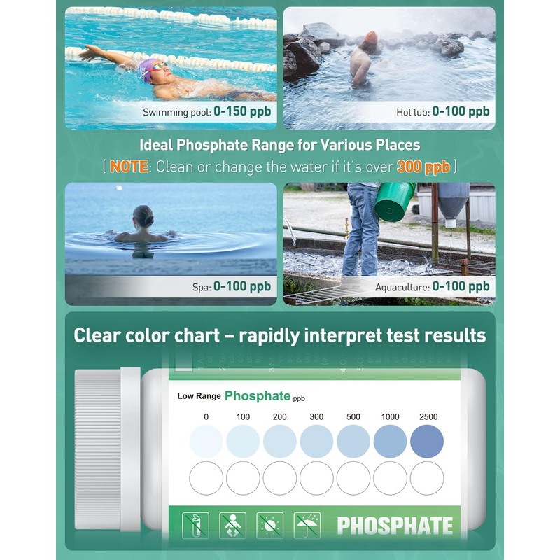 • Fast & Accurate Result: Test range: 0-2500 ppb. The pool test strips are highly sensitive to detect even low levels of phosphate. And the easy-to-read color chart helps you instantly interpret the test results. Rapidly uncover water problems in minutes.