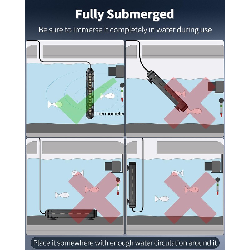 - Fully Submerged: The heater should be completely immersed in water during use. It is applicable for 20-30 gallon fresh, marine and tropical aquariums.