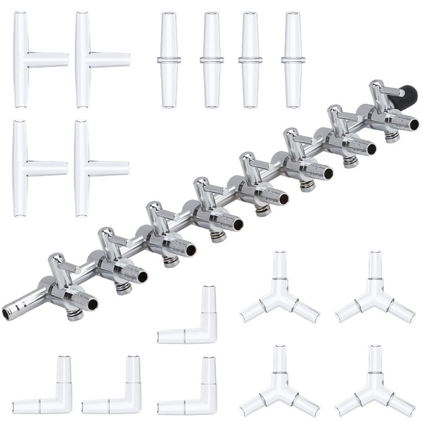 Pawfly - Válvula de control de flujo de aire para acuario (8 vías, cromo y cobre, distribuidor de tanques de peces), Inlet 3/16"
