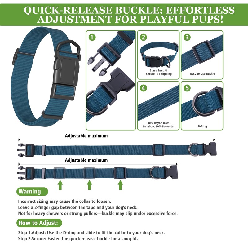 - QUICK-RELEASE BUCKLE WITH TIGHT SECURE: Effortless Adjustment for Playful Pups! No more slipping or constant adjustments—collar stays snug and secure. Whether your dog’s playful or active, the adjustable design ensures comfort. The quick-release buckle keeps it tight but opens easily when needed. Important: Incorrect sizing may cause the collar to loosen. Ideal for small to medium dogs, but not for heavy chewers or intense pullers—buckle may slip and material may not withstand excessive force