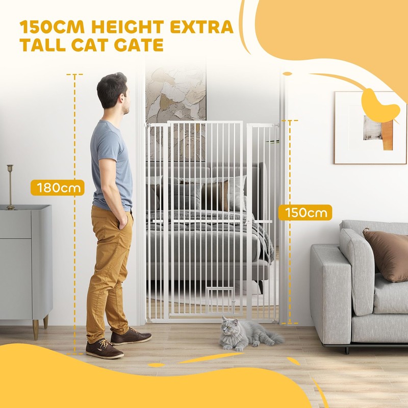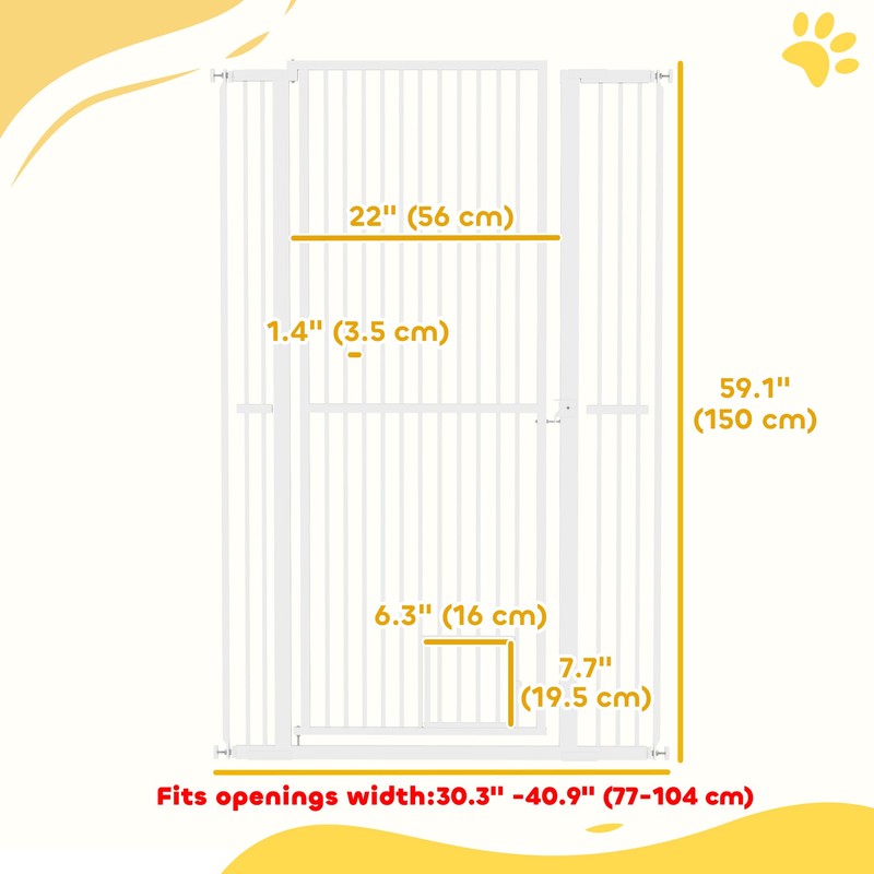 Keep your curious cats safely entertained! The PawHut pet gate with cat door stands tall at 59", foiling even the most ambitious feline jumpers. It's kitten-proof With a narrow 1.4" bar spacing. Great for any doorway or hallway, this robust gate includes a cat door for feline freedom while keeping larger pets at bay. Suitable for multi-pet families.