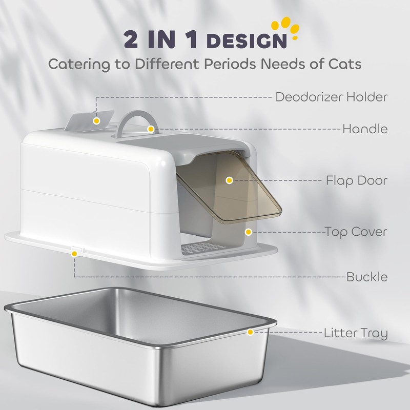 Transform your cat care routine with the PawHut Cat Litter Box with Lid. Featuring a sleek stainless steel tray that's a breeze to clean and a built-in sand filter for easy maintenance. The enclosed setup, for optimal odor control, is equipped with two filter bags included. Suitable for cats under 13 lbs., this large litter box offers versatility and convenience.