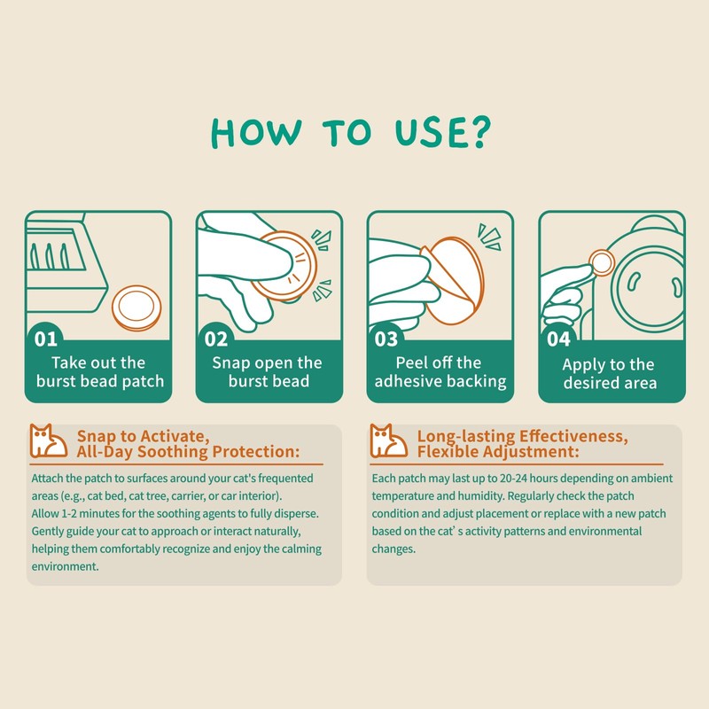 - Stick Anywhere, No Plug or Heat Required – Unlike traditional plug-in cat calming diffusers, this calming pheromone patch works instantly after activation. Simply press to release, then stick it to carriers, cars, crates, walls, or furniture. No outlet, no refills, no mess.