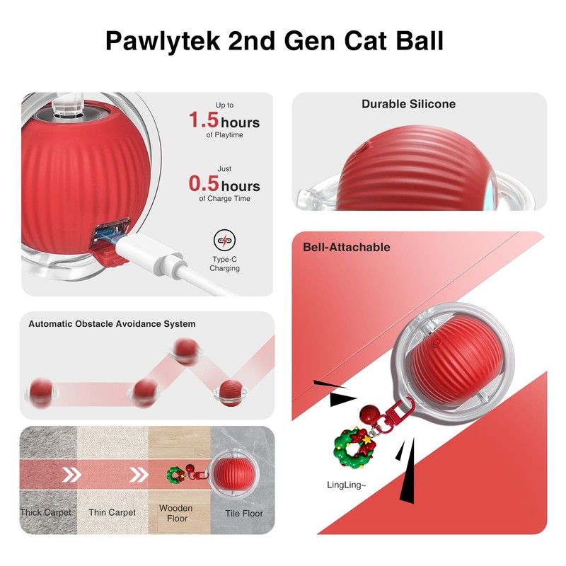 Fast Rolling: Pawlytek cat toy ball that automatically performs rolling, bouncing, or enticing actions based on cat's contacts.