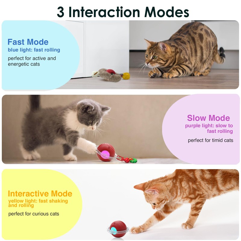 - Enhanced Interaction! In our automatic cat ball toy, you can choose from 🟡 fast running (blue), 🟣 slow running (purple), and 🔵 interactive mode (yellow) to keep your cat engaged and entertained