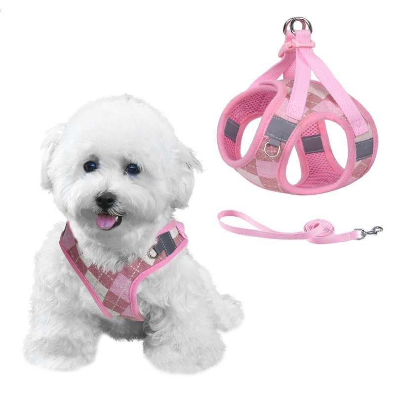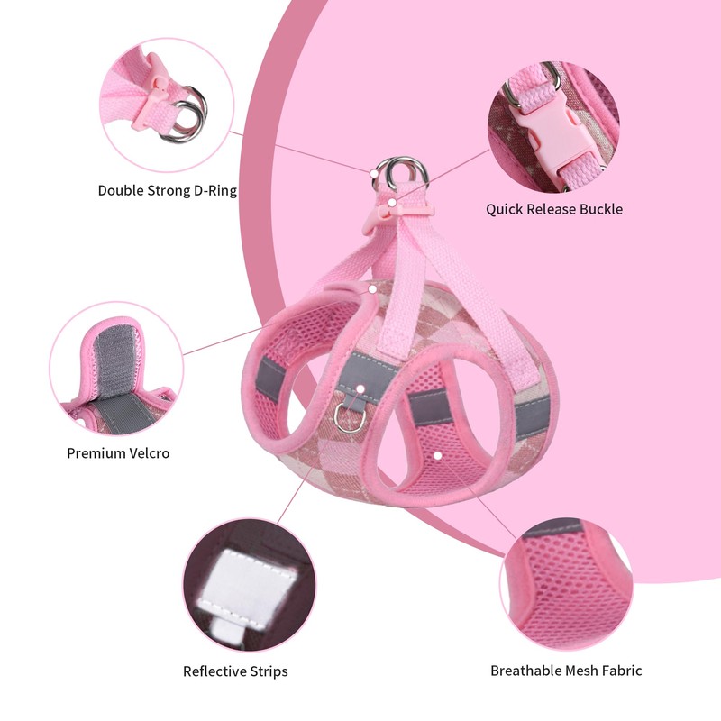 PawSailor Step-in Small Dog Harness and Lead Set No Pull No Choke Plaid Escape Proof Dog Vest Harness Breathable Soft Reflective for Puppy Small Dogs, Cats Pink XS