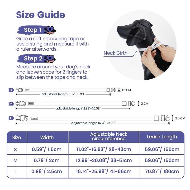 The Pawview Dog Collar and Leash Set is designed for stylish pets and thoughtful owners who care about comfort, safety, and quality. Made from high-density polyester, this adjustable dog collar and leash is built to handle daily adventures while keeping your pet looking great. The soft diving-grade lining on both the collar and leash handle provides extra comfort, preventing skin irritation and hand fatigue. With sizes for small, medium, and large dogs, this leash and collar set is a perfect fit for every breed. The durable construction and elegant Sunrise Design make it an ideal dog leash for walking, training, or outdoor play. Stay safe with our included Smart ID Tag—a waterproof, scratch-resistant dog tag with no monthly fee. Scan it via the app to help reunite lost pets quickly and easily. The entire set is machine washable, so cleanup is a breeze. Just air dry to protect the nylon webbing and leather detailing. Whether you're looking for a leash for big dogs heavy duty or a lightweight option for a pup, Pawview brings peace of mind and premium design to your daily routine.
