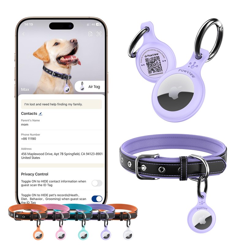 PawView Hundehalsband aus echtem Leder mit Smart-ID-Tag, verstellbar und personalisiert für kleine Hunde, atmungsaktives PU-Futter, Anti-Verlust-QR-Code (S, Violett)