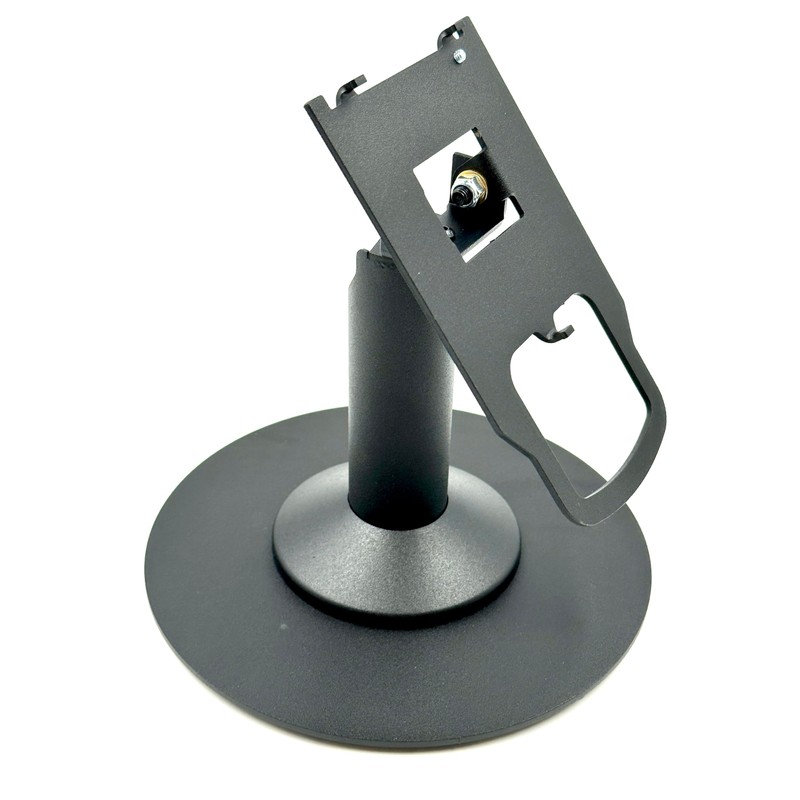 Manufactured in sturdy steel with durable powder coated finish Essential to enhance customer experience; POS terminal stand is great for customers and merchants; stand can tilt up to 60° and swivel a full 190°, making moving device from customer to merchant easier; improves payment transaction Ultimate convenience for merchant and customer; designed to bring terminal closer to the customer; stand is upgradeable in the field with a simple top plate swap; stand is compatible with any round or square Discount Credit Card Supply freestanding plate Stand allows for seamless customer interactions with less danger of harm to equipment; flange cover hides wires and mount keeps terminal secure for minimized chances of damage and theft to POS terminal; durable powder coated finish protects stand Includes 8" x 8" round countertop plate which increases flexibility and allows the mount to be freestanding. Simply screw the stand to the plate with enclosed screws. Swivel and tilt stand is supplied fully built for a simple installation; two easy installation methods; includes screws and an adhesive pad for two options of securing holder; terminal not included; fits PAX Q30 ; pole stands 5.5”tall