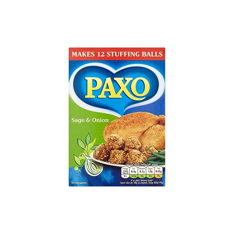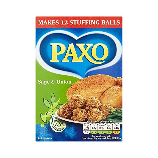 Product DescriptionPaxo Sage & Onion Stuffing Mix makes 12 delicious stuffing balls. Paxo was invented in 1901 by John Crampton, a butcher from Eccles in Manchester, who wanted to make Sunday lunches more exciting. It was a slow start, because stuffing is mainly served with poultry, which was a luxury at the time. But as the price of chickens dropped in the 1950s and 60s, Paxo stuffing's popularity really took off. Today Paxo has a range of stuffings to suit your favourite roast dinner.IngredientsWHEAT Flour (with added Calcium, Iron, Niacin, Thiamin), Dried Onion (15%), Vegetable Oils (Palm, Sunflower), Salt, Dried Sage (1.5%), Dried Parsley, Raising Agents (Ammonium Carbonates, Sodium Hydrogen Carbonate), BARLEY Malt ExtractContains: Barley, WheatDirectionsThere's so much you can do with Paxo. . . Whether it's baking in a tray, mixing together with sausagemeat or rolling into stuffing balls, Paxo makes your roasts taste fantastic. Paxo offers a great way to add texture and flavour to all kinds of dishes. Why not try serving with pork chops, steaks or fish to add a delicious crunch and flavour. It's also great as a stuffing for tomatoes and peppers for a Mediterranean twist.Manufacturer Contact InformationUK: Freepost Premier Foods. Or ROI: Premier Foods ROI, PO Box 13008.