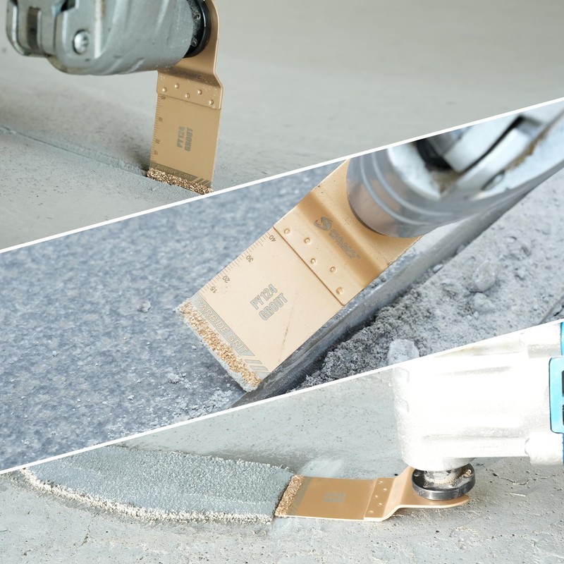 - The straight and thin design makes the oscillating tool blades perfectly fit into tight spaces that other oval grout blades can't. It can achieve application like finishing the installation of electronics and cutting through grout, cement board and even concrete, digging out a grout job on a tile floor around some door frames, cutting panel to install outdoor outlets, etc.