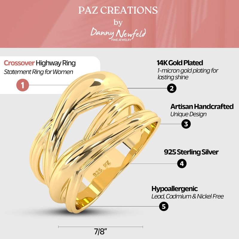 Paz Creations 925 Sterling Silver Criss Cross Statement Ring For Women, Artisan Handcrafted Designer with 1 Year Warranty, 14K Gold Plated, Size 8