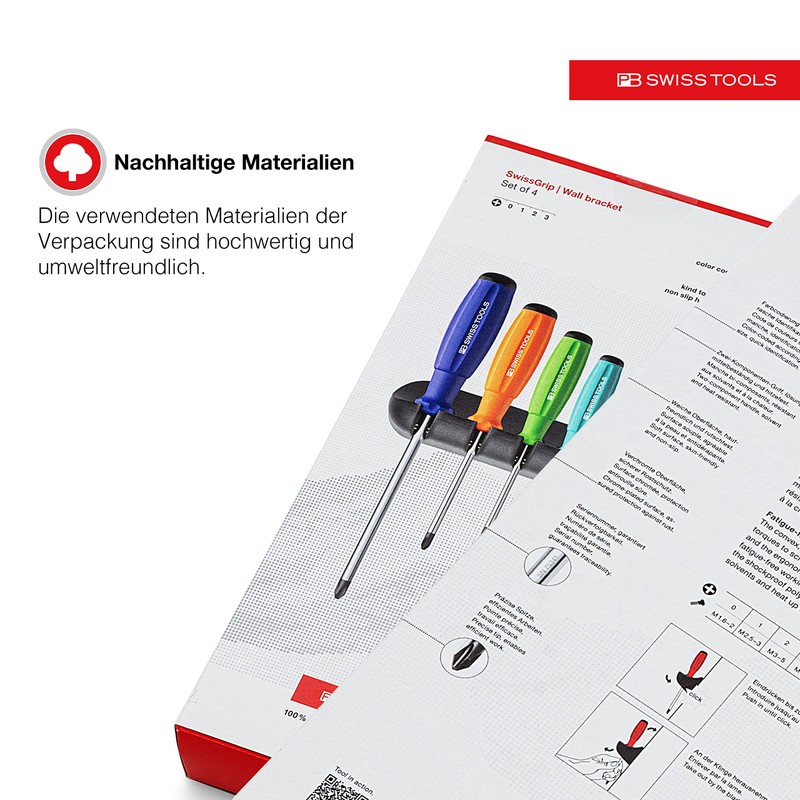 PB Swiss Tools Phillips Screwdriver Set PB 8242.RB | 100% Swiss Made | 4-piece Colored SwissGrip Screwdriver Set Size PH 0/1/2/3, including practical Wall Mount