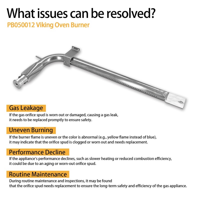- [ Problems it can solve ] Fails to ignite; Flame is unstable or yellow; Strong gas odor when using the oven; Burner or gas flow makes unusual noises. The issues mentioned above can be perfectly resolved by simply replacing this PB050012 oven replacement tube