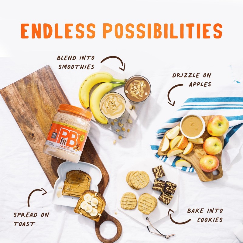 - BLEND, BAKE, OR SPREAD: when it comes to the uses for PBfit, the possibilities are endless! Mix into baked goods like bread, pancakes, waffles, and cookies to add a great peanut butter flavor. You can also blend it into breakfast smoothies and other drinks for a tasty, low-fat protein boost. It's also great in yogurt, oatmeal, and in sandwiches