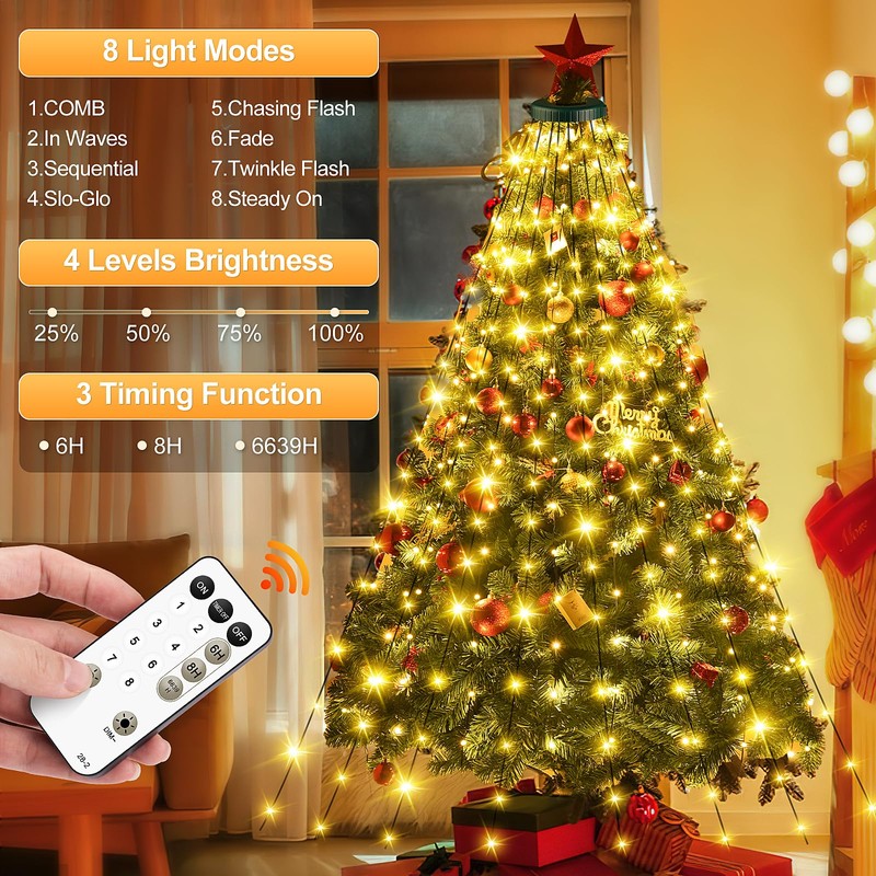 - 【8 Modes & 4-Level Brightness】The tree lights feature 8 modes and 4-level dimmable brightness to create your desired atmosphere for your Christmas tree decor, whether it's a soft glow or a dazzling light display. Bring the joyful Christmas to your family with these easy-to-use and stylish tree lights.
