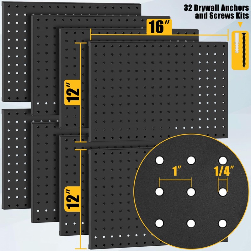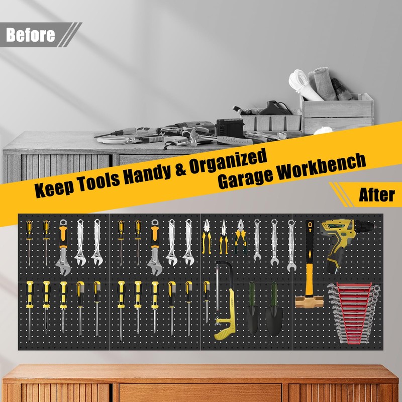- Great for Tools Organization: This garage storage pegboard system can be DIY according to your storage needs. Each 16 x 12 inch pegboard with 1/4 inch holes, 8 pegboards can form a 48 x 32 / 64 x 24 pegboard wall. Suitable for organizing garage tools or garden tools and all kinds of tools. A nice choice for storing and holding your tools in kitchen, garage, utility room, basement or shed