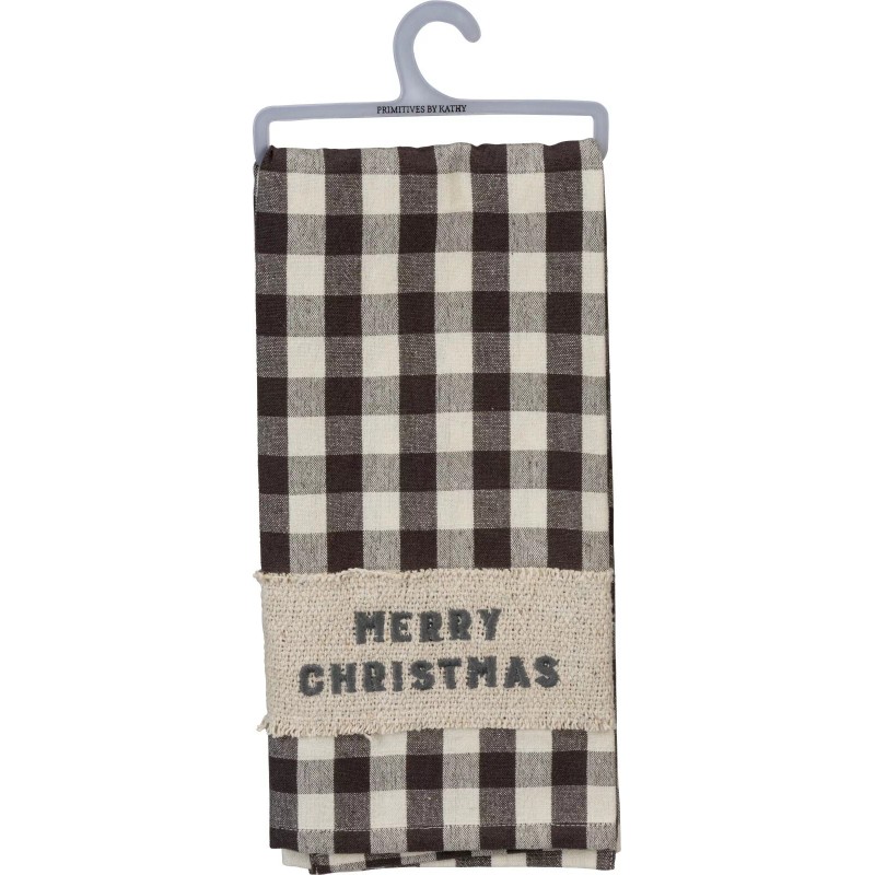 A farmhouse-inspired cotton dish towel featuring an embroidered "Merry Christmas" sentiment, panel stitched jute accent, and checkered background print. Machine-washable.