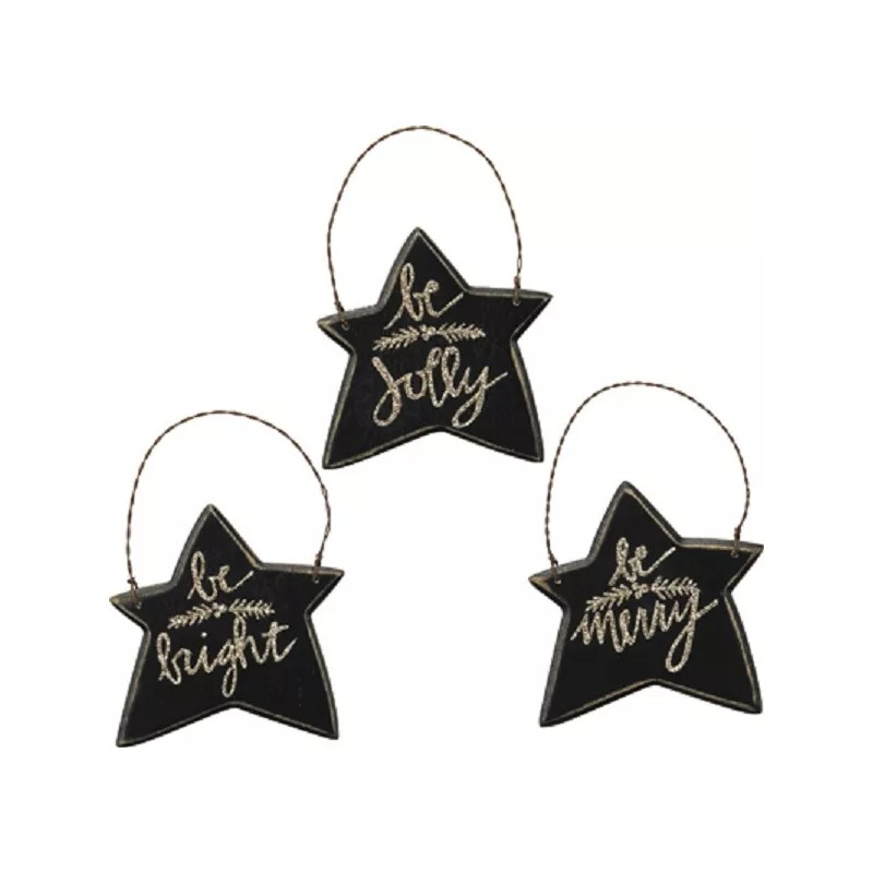 PBK Wood Christmas Black Star Ornament Set of 3~Be...Merry Bright Jolly~Wreath/T