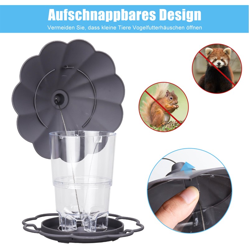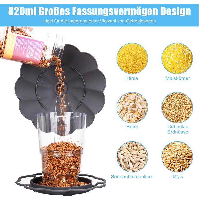 - Weatherproof and sun protected: the large lid of the bird feeder has a diameter of 16 centimetres and is equipped with eave-like grooves that protect the grain from sunlight and freezing rain, snow and ice. The bird feeder is made of high quality PP+PS material, resistant to sunlight and UV rays, durable and durable.