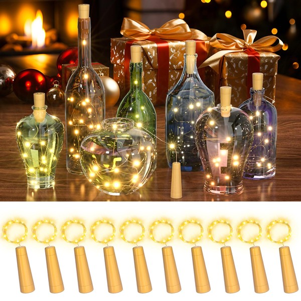 PChero Wine Bottle Cork Lights with Timer, 10 Pack 20 LED 6.6 ft Fairy String Lights Battery Operated for DIY Party Wedding Christmas Festival Bar Decoration, Warm White