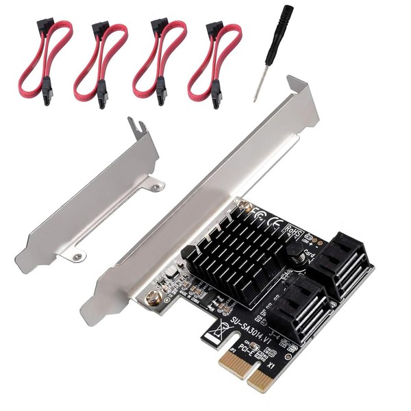 - The product includes PCIE 1X SATA card 4 ports x 1, SATA cable x 4, short bracket x 1 and small screwdriver x 1.