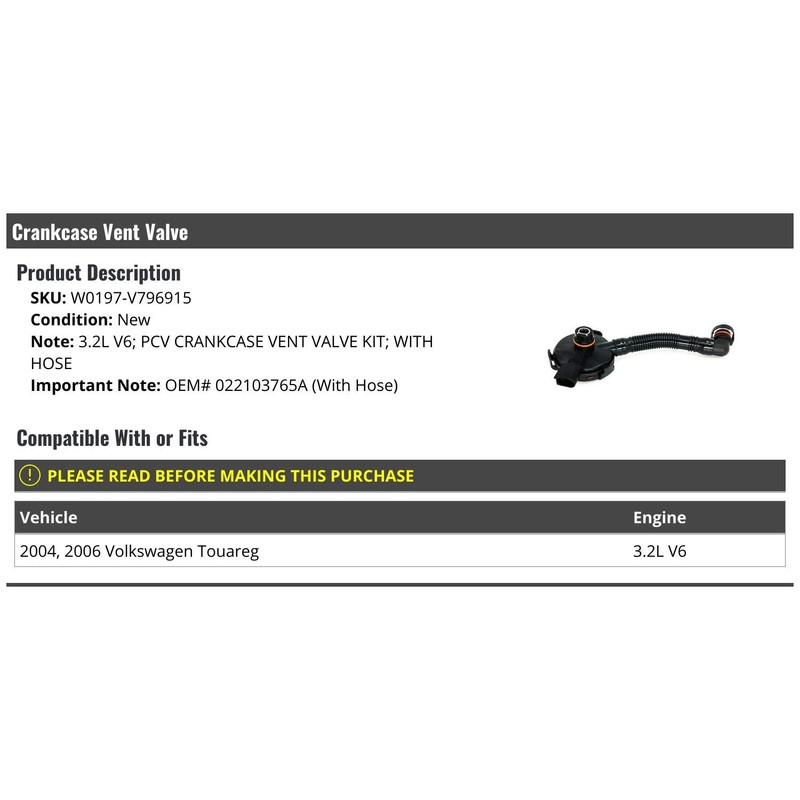 - 3.2L V6; PCV CRANKCASE VENT VALVE KIT; WITH HOSE