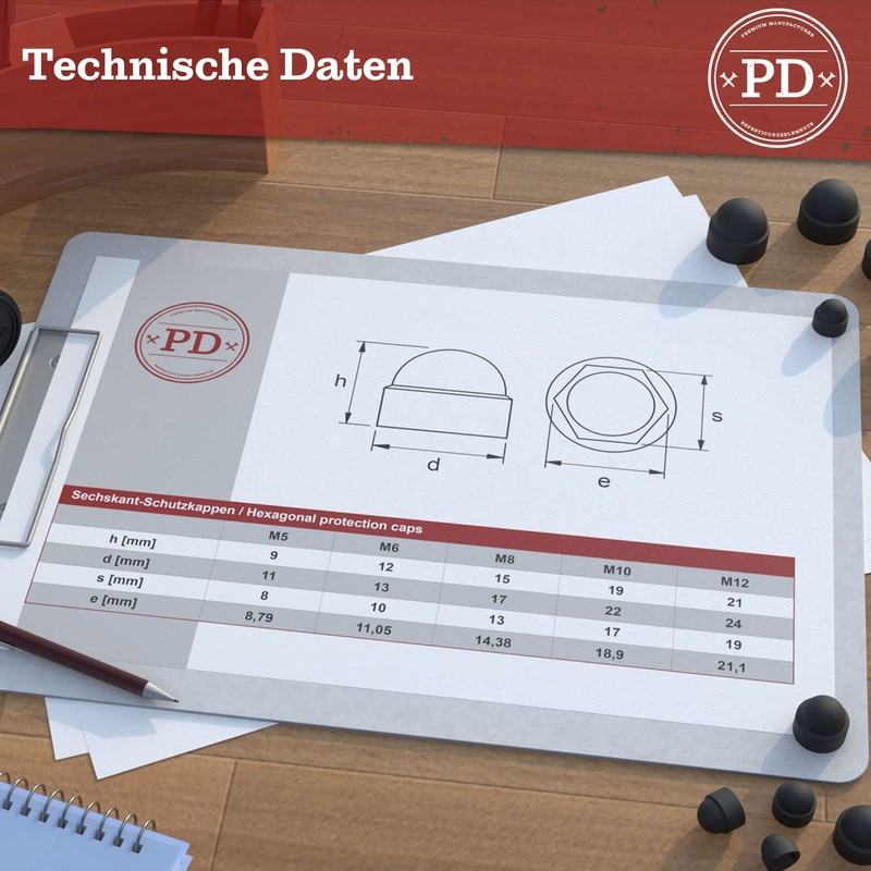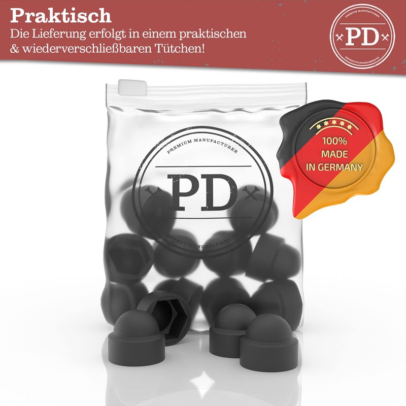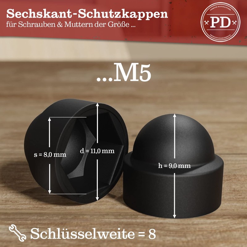 PD® Hexagonal protective caps M5 (wrench size 8) - cover caps for screws black made of plastic - durable cover caps for nuts and screw head - screw cover black - pack of 50