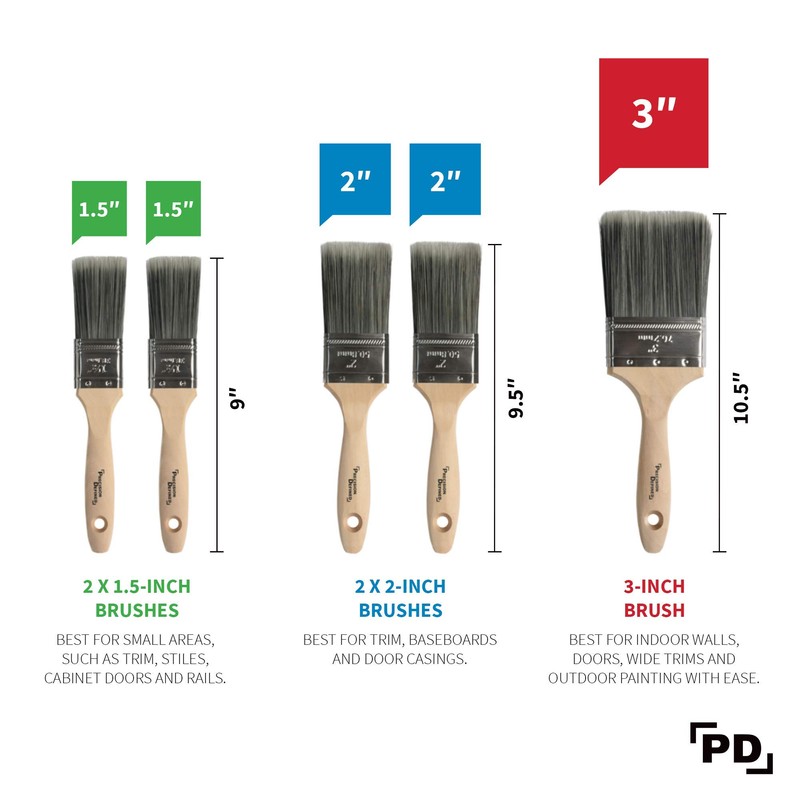 - ✔ EACH SET INCLUDES: Our standard paint brush set includes one 3” brush, two 2” brushes and two 1.5”. That’s a total of 5 premium paintbrushes that’s perfect for home touch-ups and home renovations, painting bathrooms, outdoor decks, nursery room, and even a game room!