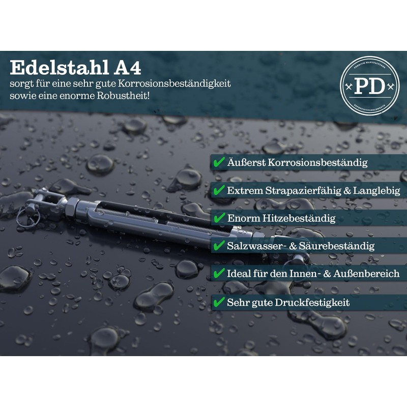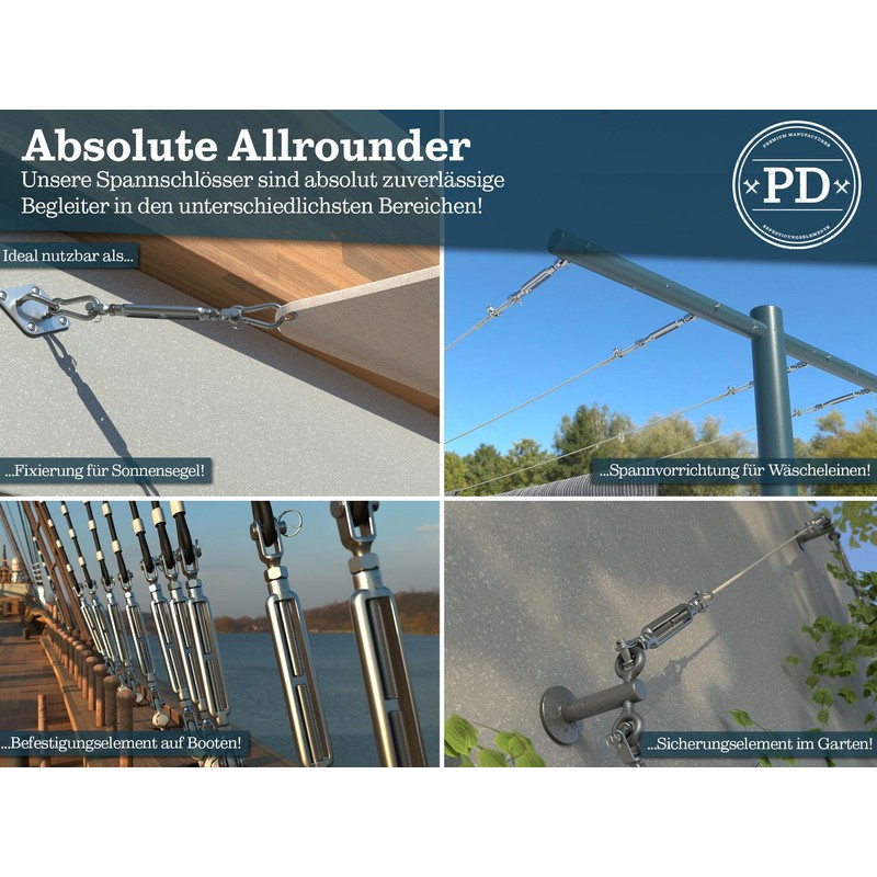 - Easy to use: our stainless steel rope tensioners ensure a problem-free and reliable tension of your ropes. With their precise thread, they allow for easy and accurate adjustment.