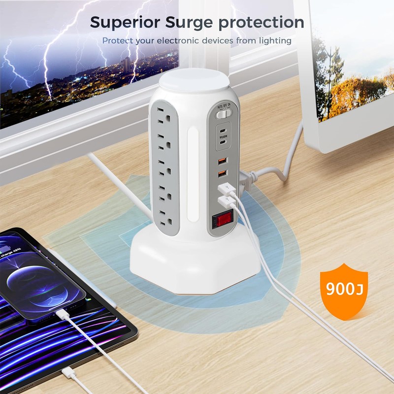 - 【Charging Tower & Overload Protection】: power surge with light,overload protection protects against spikes and fluctuations. This power strip tower has overload protection, short-circuit protection, over current protection, over-voltage protection, over-temperature protection, surge production, and lightning protection. It will automatically cut power to protect connected devices when the voltage surge is overwhelming.